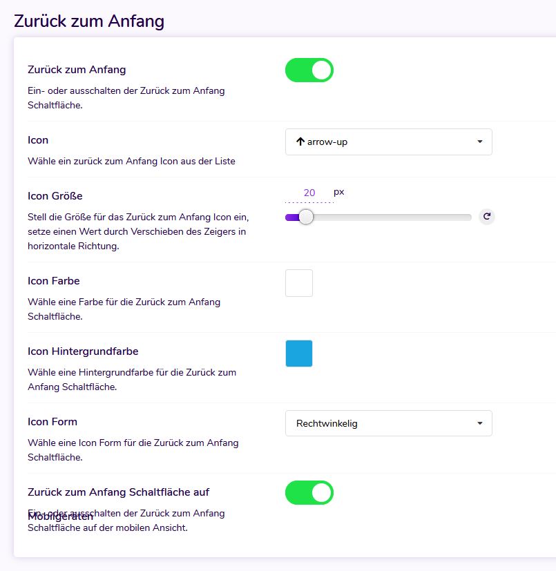 Mit der Funktion "Nach oben" können Ihre Benutzer vom unteren Rand der Seite zum oberen Rand der Seite scrollen. Die Aktivierung erfolgt über das Backend.